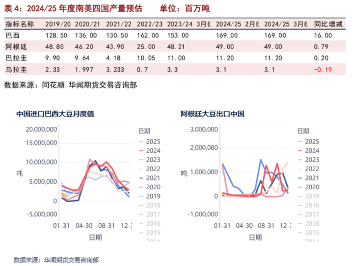 根据天气预报,3月下旬阿根廷东北部地区降雨量偏少,将加剧该地区大豆的旱情。因此,2024/25年度阿根廷产量继续下滑的概率增加,目前BAGE预计阿根廷产量在4800-4900万吨区间,较前期预估下滑100万吨。