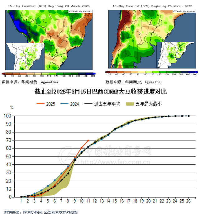 巴西收获进度加快。巴西国家商品供应公司(Conab)公布的周度作物种植与收割报告显示,截至2025年3月23日,巴西2024/25年度大豆收割率为69.8%,较此前一周提高8.9个百分点,高于去年同期的61.9%。